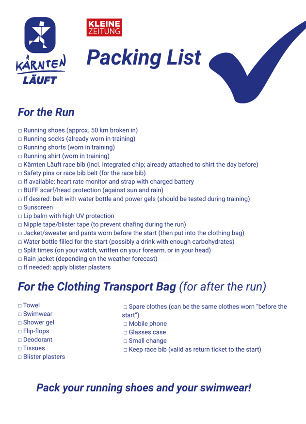 To make sure this doesn’t happen to you during Kärnten Läuft weekend, you’ll find a complete packing list here for your perfect race day. Often it’s the small things you wouldn’t need for the “pure” act of running, but these little details can be very important for some runners. That’s exactly why we’ve put together a dedicated Kärnten Läuft checklist (see sidebar on the right), so you don’t forget anything important.