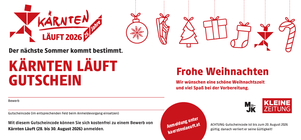 Wir senden dir dann die Kontoinformationen und eine spezielle Kärnten Läuft Gutscheinkarte zum Download inkl. Gutscheincode für den bestellten Bewerb umgehend zu.